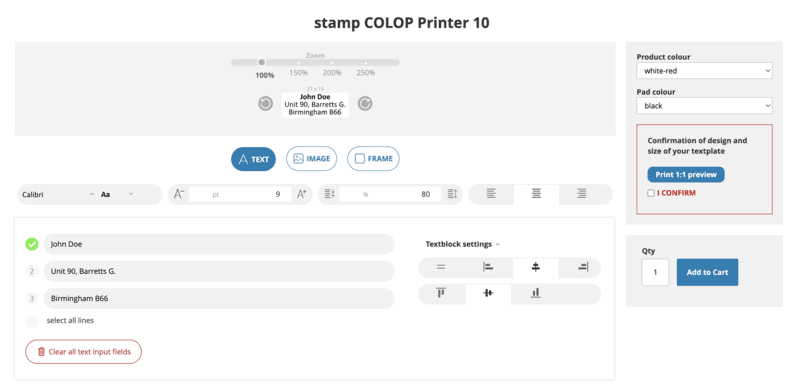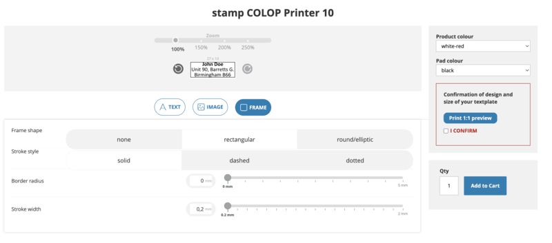 W tym kroku możesz samodzielnie zdefiniować wygląd odcisku pieczątki. Do wyboru masz niezliczone czcionki, rozmiary czcionek, wyrównanie i inne parametry stempla. Niewątpliwą zaletą jest automatyczna kontrola – system nie pozwoli Ci kontynuować, jeśli stempel nie będzie czytelny lub może wystąpić inny problem podczas późniejszego wykonywania odcisku. Możesz również przesłać nam swoją grafikę bezpośrednio do systemu.