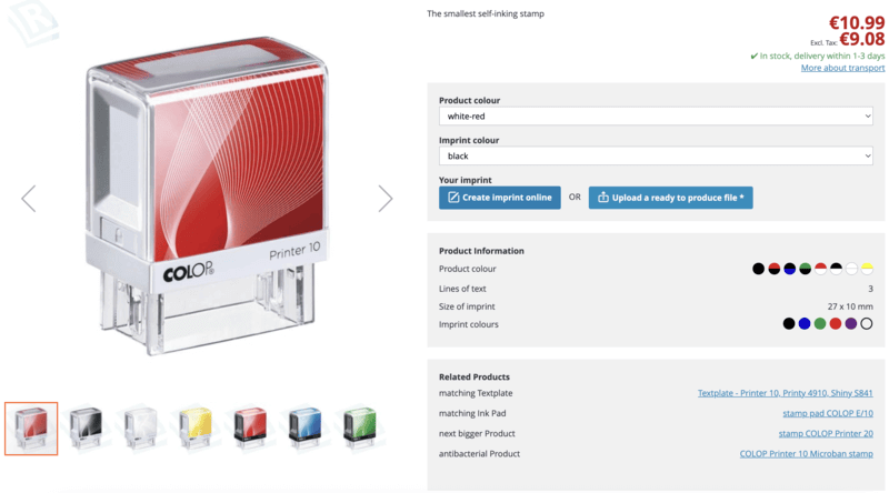 Po kliknięciu na dowolną pieczątkę wyświetlą się szczegółowe informacje wraz z wieloma opisami, powiązanymi produktami – alternatywami, zapasową poduszką, matrycą (płytką tekstową), podobnymi produktami.