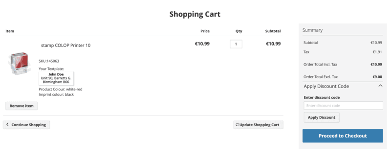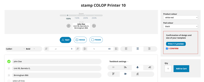 Przed dodaniem produktu do koszyka system ponownie poprosi Cię o zatwierdzenie ostatecznego wyglądu graficznego Twojej pieczątki – możesz wydrukować odcisk w skali 1:1 lub zapisać go w projekcie na później.