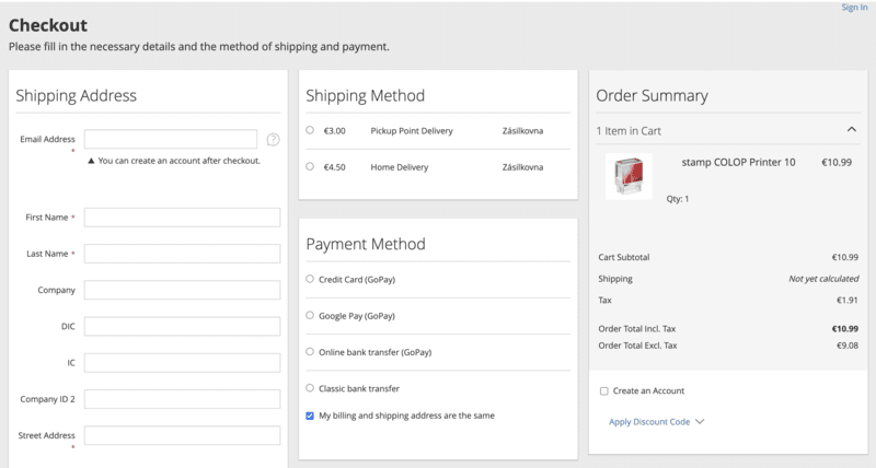 Na następnej stronie proszę podać adres rozliczeniowy, sposób dostawy i sposób płatności. System automatycznie przeliczy wszystko. Nie ma problemu, aby wybrać inny adres rozliczeniowy i dostawy. Wszystkie towary wysyłamy na terenie całej Republiki Czeskiej. Jeśli chcą Państwo zostawić nam wiadomość lub uzupełnić informacje, proszę skorzystać z pola uwag.